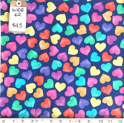 Strong pastel colour hearts bounce off a light navy background. The hearts are approx one inch (25mm ) at their widest point. Shades are orange, tangerine, turquoise, aquamarine, magenta, purple, soft gold and iris.