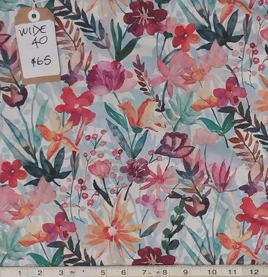 There is a gentle water colour look to these prints. This one has a very light background with flowers in shades of teal and sort of mandarin. The leaves are in rich shades of teal and russet.